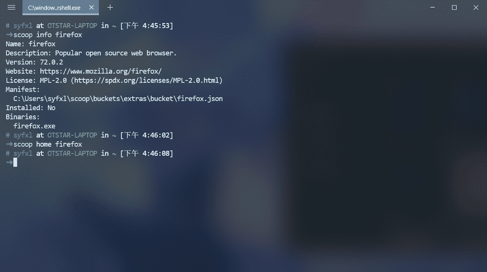 ? 查看软件相关信息,当我们通过搜索找到软件的名称,但是不确定是否是该软件的时候,我们就可以通过 scoop [info|home] <app> 进一步确认软件